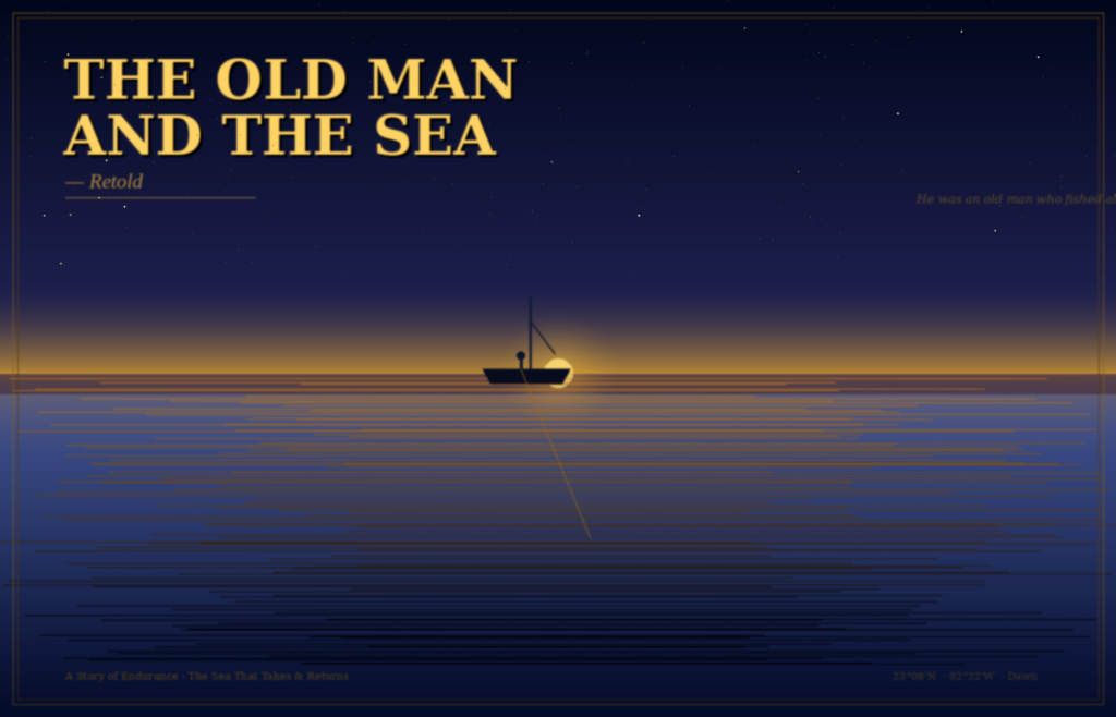 By nightfall, his hands were bleeding. He rinsed them in the sea, which stung, and he kept his grip. In the dark, the fish became mythological a presence below him, patient and enormous, pulling him toward somewhere it had decided to go. He thought of every large fish he had caught in his life. He thought of his wife, who used to say, “The sea takes what it wants.” Give it willingly, and it gives back. He had never fully believed her. He believed her more now.